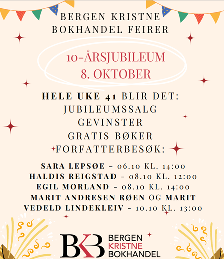 Bergen Kristne Bokhandel (BKB) har 10-årsjubileum 8.oktober. Dette feires i uke 41 med jubileumssalg og forfatterbesøk blant annet.