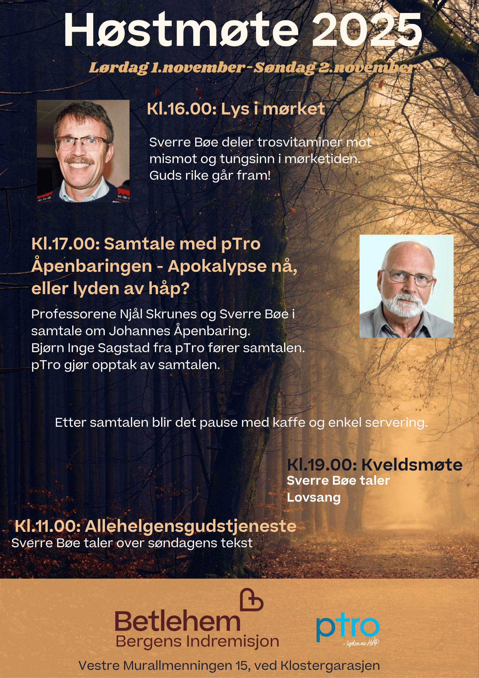Kl. 16.00: Møte, Sverre Bøe. Tema, Guds rike går fram! – trosvitaminer mot mismot og tungsinn i mørketiden.